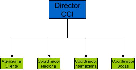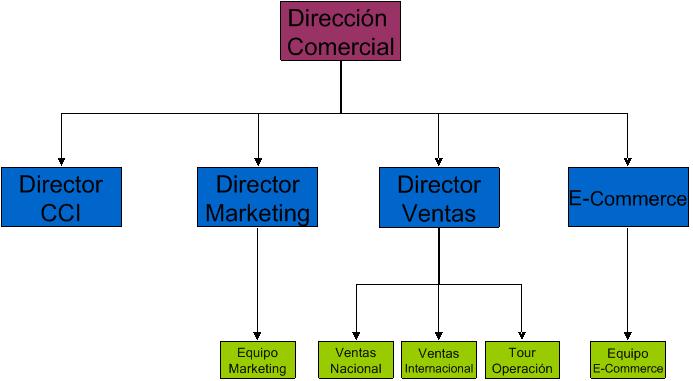 Éste «nuevo departamento» no reporta directamente a la propia Dirección del establecimiento si no que vendría insertado dentro de la estructura de un departamento comercial más grande, el cual a parte de tener este CCI como su parte de operación más interna, debe tener un equipo Comercial Externo y otro de E-Commerce, que son los encargados de las visitas a clientes, ferias, manejo de Key Accounts, creación de acuerdos de colaboración con empresas, etc… El organigrama entonces podría quedar, de manera básica, como sigue: